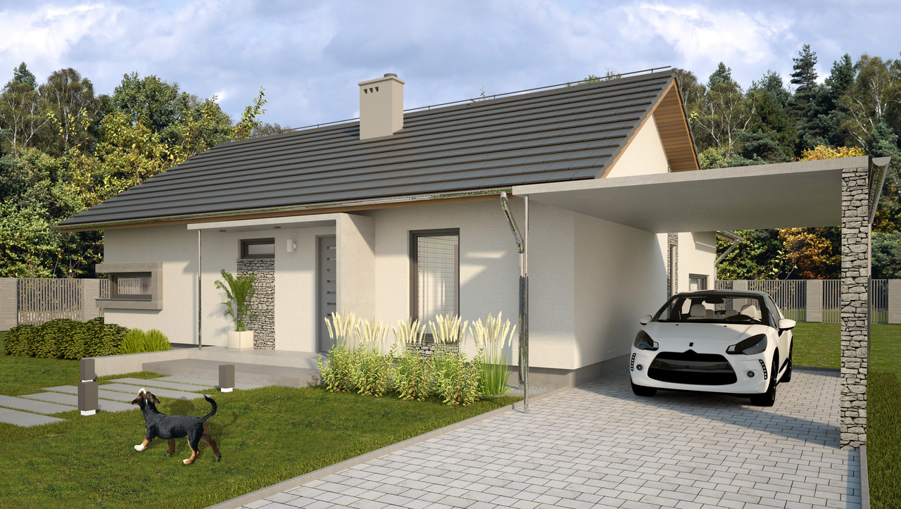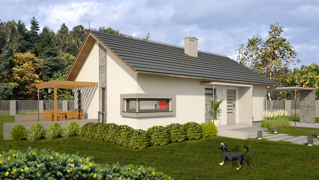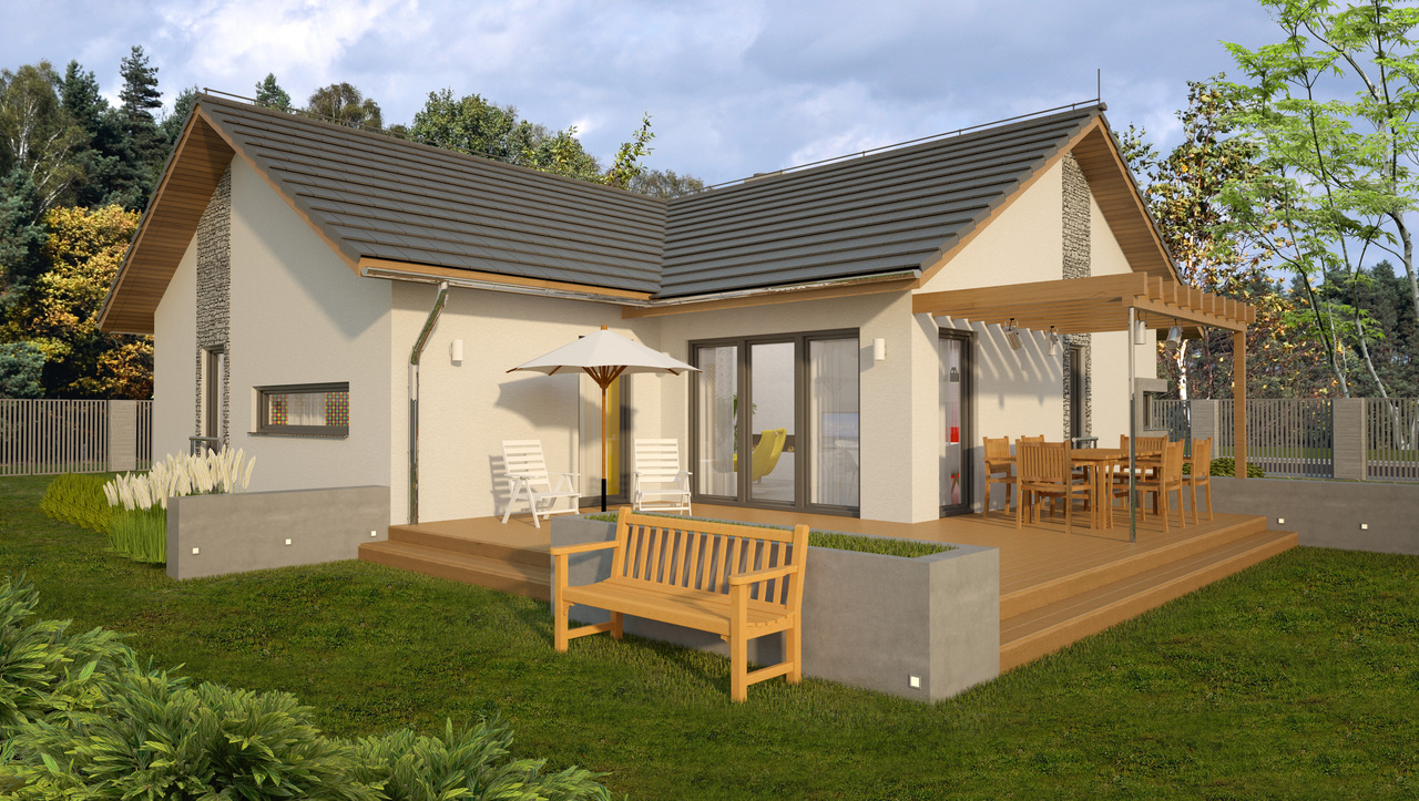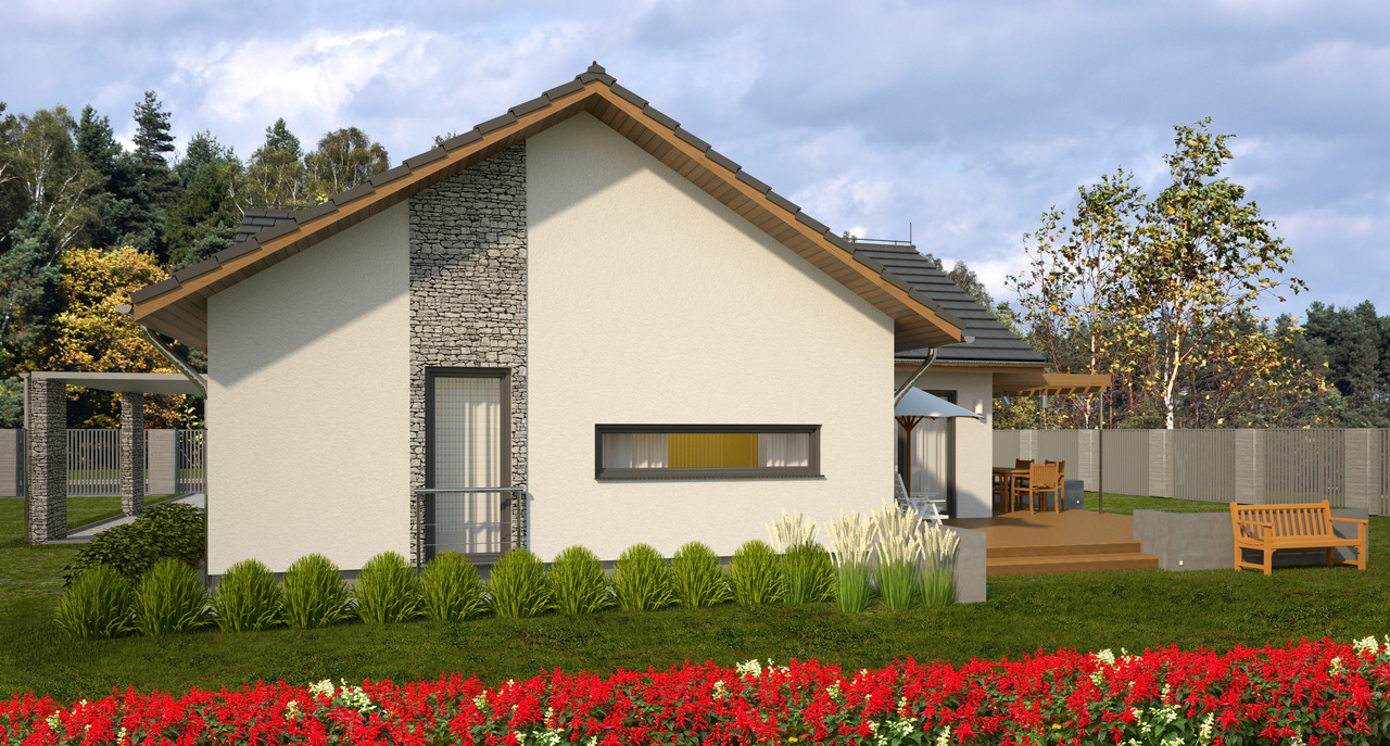 Přízemní dům je určen pro čtyřčlennou rodinu, která si cení pohodlí a funkčnost. Venkovní fasádu z tenkovrstvé omítky doplňuje zajímavě řešený vstup se stříškou a kamenným obložením. Chráněn je také vstup z obývacího pokoje do zahrady, který tím získává více reprezentativní charakter.