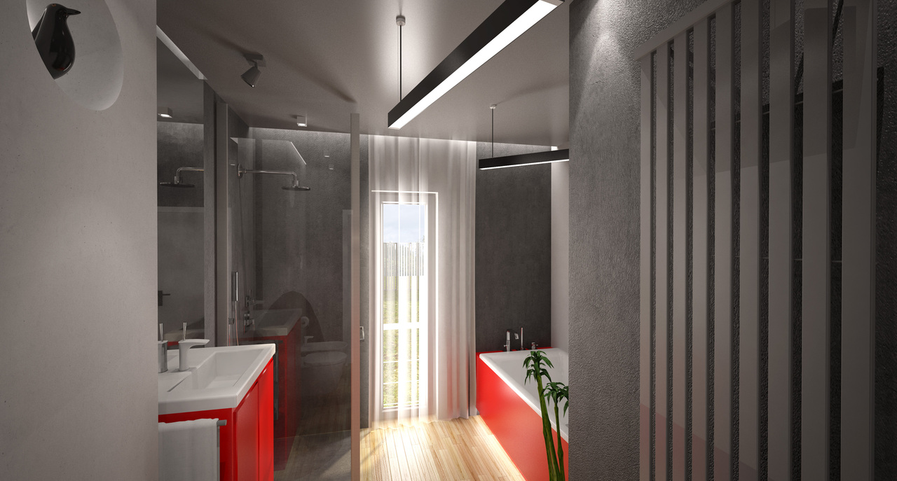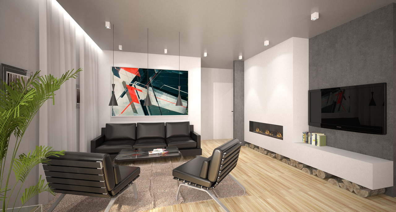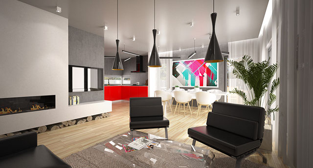 Je zde umístěn efektní originální krb a působivé domácí kino. Velká okna v obývacím pokoji navozují dojem, že terasa působí jako součást interiéru místnosti. Kromě toho, v denní části je toaleta určená pro hosty a zádveří, které poskytuje prostor pro šatní skříň. Naproti tomu noční část to je svatyně domácnosti.Chodba vede ke třem ložnicím, které patří dětem a rodičům. Mezi pokoji je umístěna velká koupelna a také malá toaleta, která je určena pro hosty. Velmi světlé a moderní pokoje jsou zařízeny v jednotném odstínu bílé, v kontrastu s dřevěnými parketami.