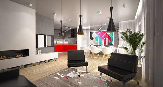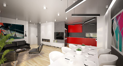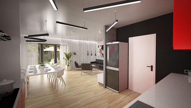 Vědomě uspořádaný vnitřní prostor domu umožnil zřetelné rozdělení dvou zón: denní a noční. Nejdůležitějším denním prostorem je přijímací pokoj spojený s jídelnou a kuchyně s technickou místností. Moderní povahu kuchyně zdůrazňují barové stoličky, které jsou umístěny u vysokého ostrůvku kuchyňského pultu.Obývací pokoj je otevřená a tím i velmi prostorná místnost, kde si můžete určitě dopřát příjemný odpočinek.