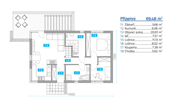 V přízemí je situován prostorný obývací pokoj s jídelním koutem sousedící s otevřenou kuchyní, a také komfortní koupelna, dvě ložnice a praktická technická místnost. Z obývacího pokoje je výstup na terasu zastíněnou dřevěnou pergolou, která zajišťuje propojení se zahradou, a také umožňuje příjemný relaxaci a odpočinek uprostřed přírody.
