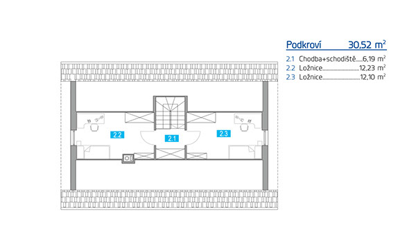 Podkroví vyloženě myšleno jako relaxační zóna. Jsou zde situovány dvě prosvětlené a komfortní ložnice s prostornými šatními skříněmi.