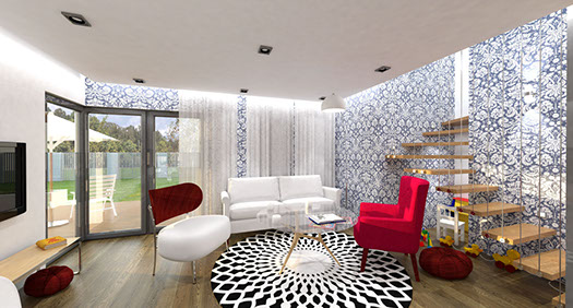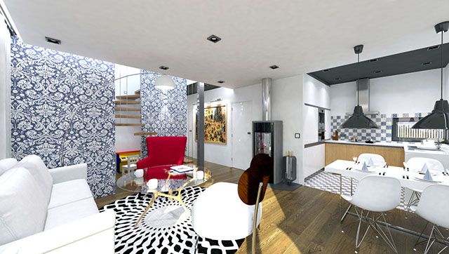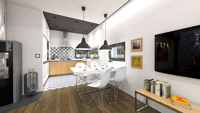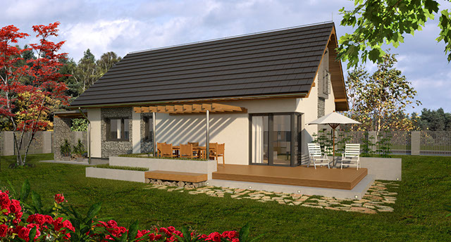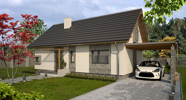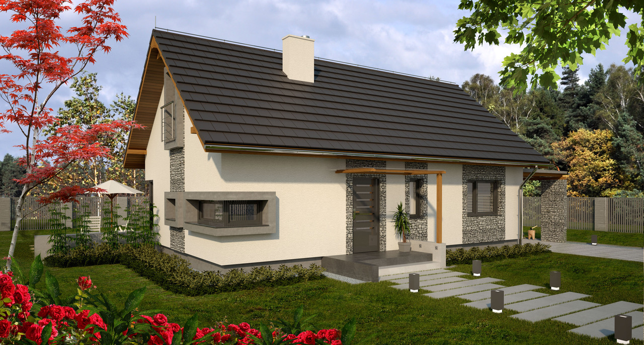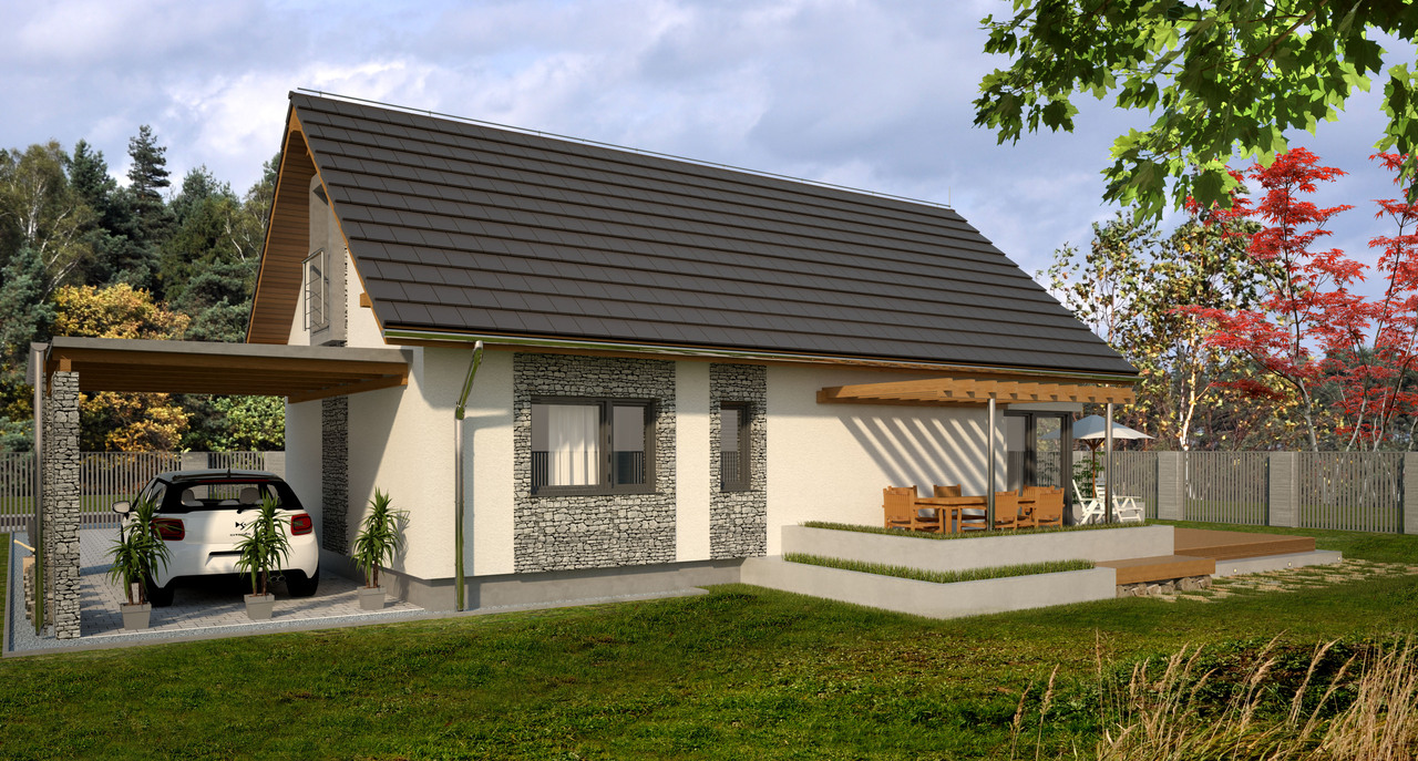 Příklad rodinného domu s typickým zaměřením a využitím pro 4 - člennou rodinu. Modernost provedení jistě zapadá do tradičního tvaru budovy. Fasáda je navržena v kombinaci bílé omítky s kamenným obkladem a charakteristickými šambranami kolem okenních otvorů.