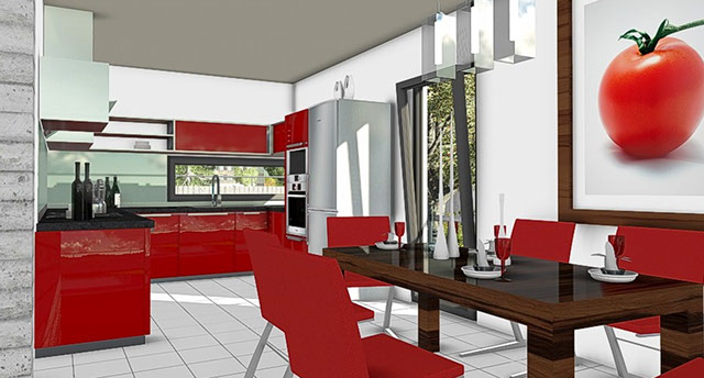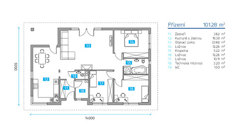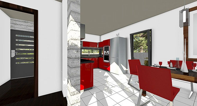 Kuchyně je navržena v levém rohu domu, diskrétně ukrytá před zraky návštěvníků. Jejím přirozeným pokračováním je jídelna, která je propojena také s obývacím pokojem. Ve zbývajícím prostor je k dispozici technická místnost s toaletou pro hosty, díky které hosté nebudou muset používat koupelnu určenou jen pro členy rodiny.