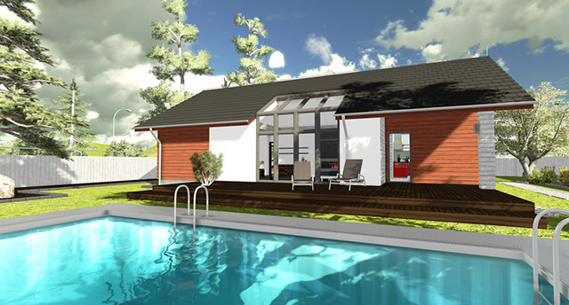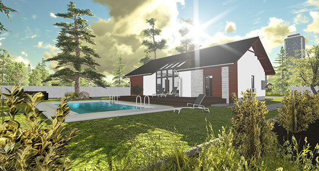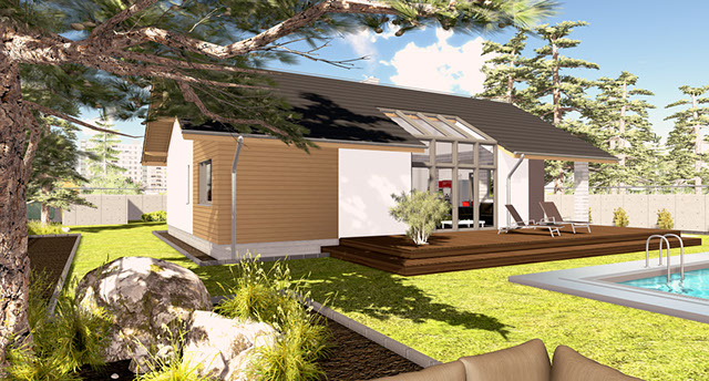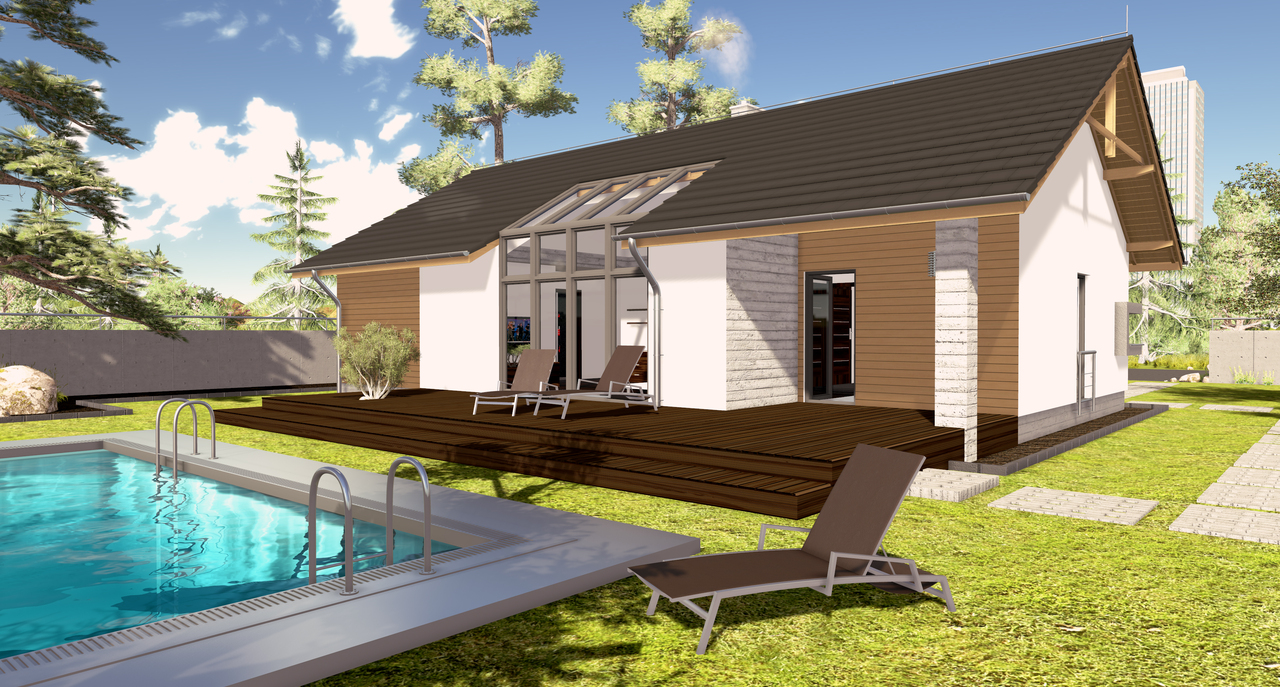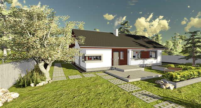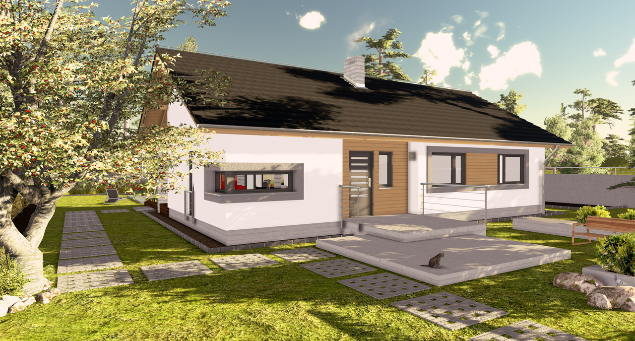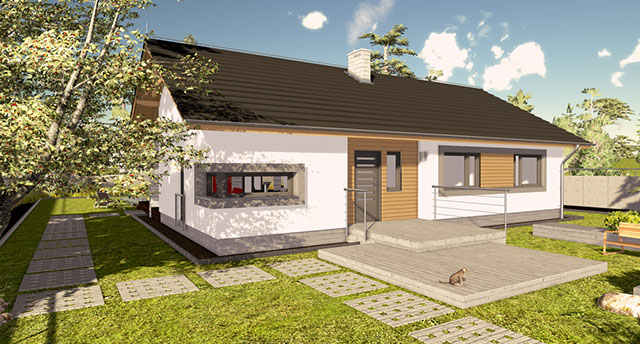 Moderní domek typu bungalov, který je s ohledem na svojí plochu – 101,28 m2, určen hlavně pro čtyřčlennou rodinu. Dům má klasický geometrický tvar zakrytý tmavou šikmou střechou. Jeho estetika vyhovuje nejnovějším trendům v architektuře. Syrová bílá omítka je doplněna teplým odstínem dřeva a světlým kamenem, takže celek má atraktivní charakter.